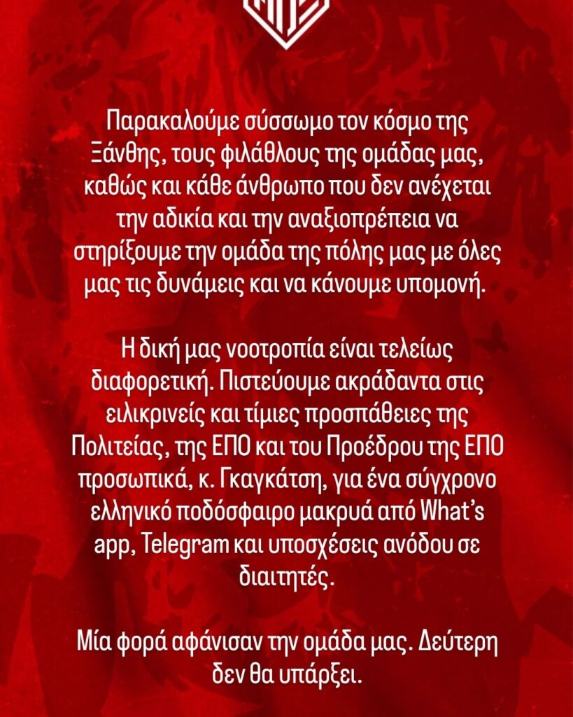 «Παρακαλούμε σύσσωμο τον κόσμο της Ξάνθης, τους φιλάθλους της ομάδας μας, καθώς και κάθε άνθρωπο που δεν ανέχεται την αδικία και την αναξιοπρέπεια να στηρίξουμε την ομάδα της πόλης μας με όλες μας τις δυνάμεις και να κάνουμε υπομονή.