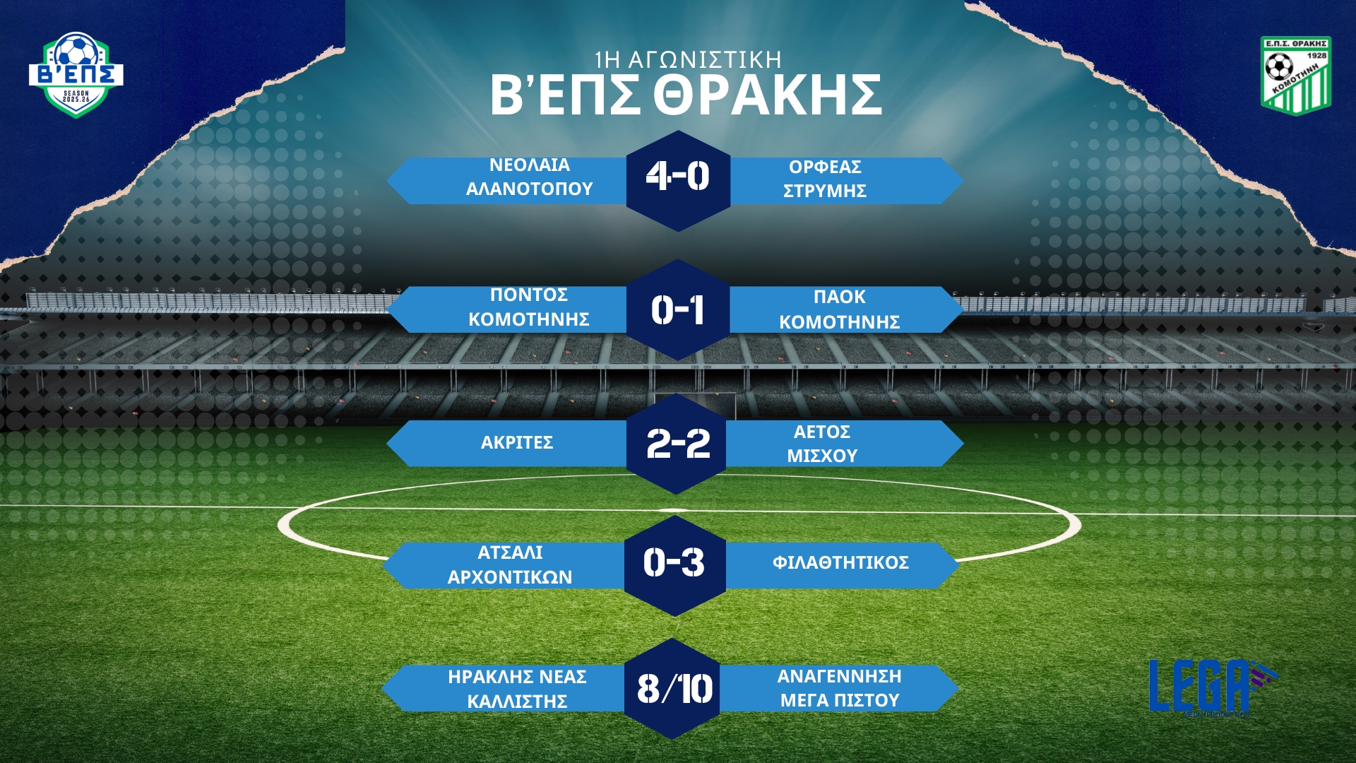 Πρεμιέρα σήμερα στην Β’ ερασιτεχνική της ΕΠΣ Θράκης και έχουμε τα παρακάτω αποτελέσματα.