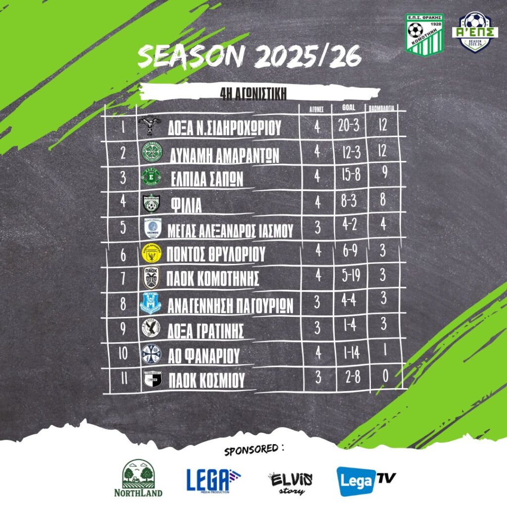 Μετά από τέσσερις αγώνες στην μεγάλη ερασιτεχνική κατηγορία έχουμε την ακόλουθη βαθμολογία
