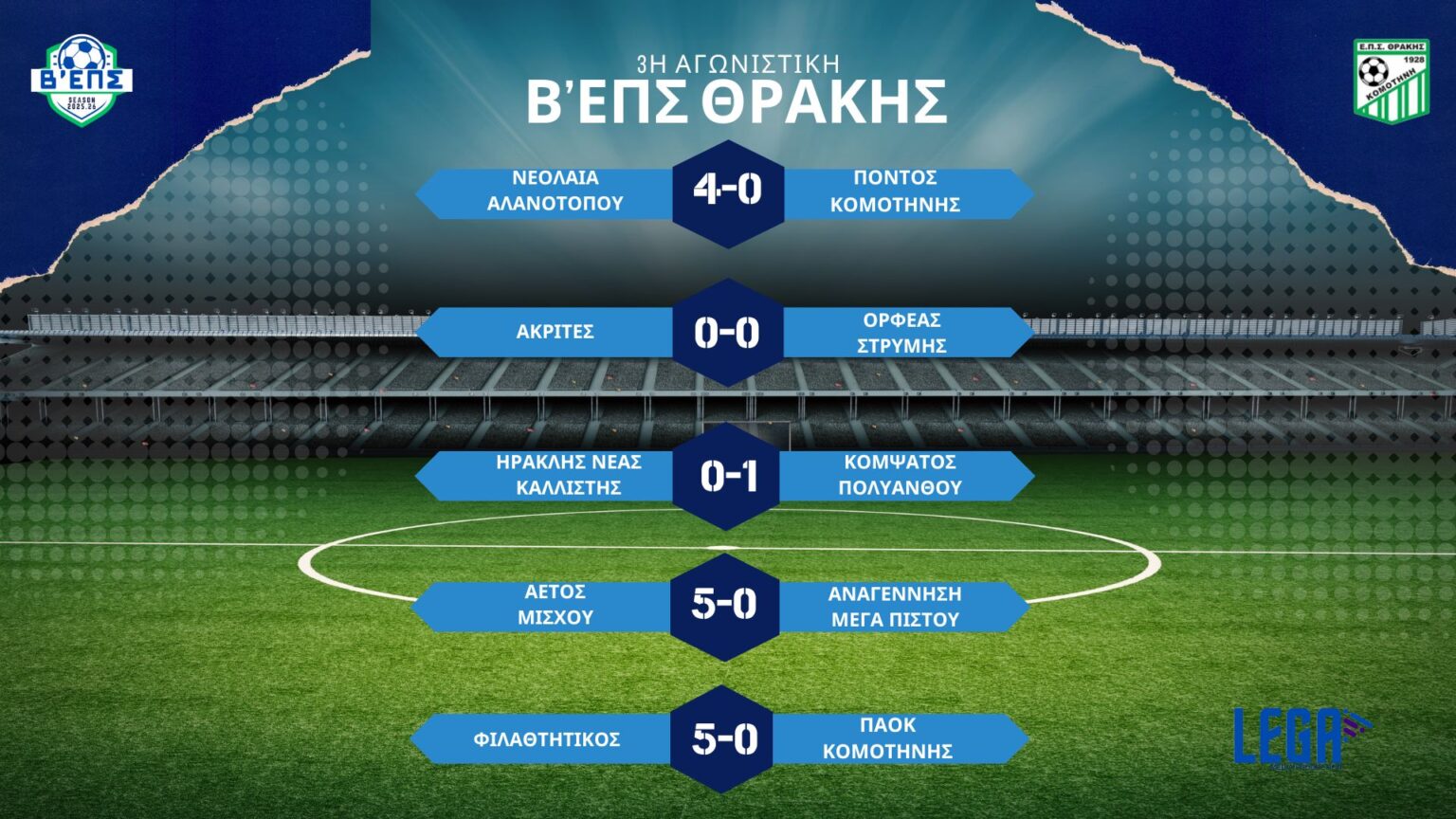 Ολοκληρώθηκε η 3η αγωνιστική για το πρωτάθλημα της Β’ ΕΠΣ Θράκης. Αναλυτικά τα αποτελέσματα