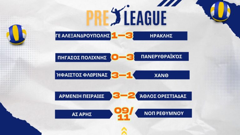 Share Facebook Email ΓΕ Αλεξανδρούολης-Ηρακλής 1-3 Πήγασος Πολίχνης-Πανερυθραϊκός 0-3 Ήφαιστος Φλώρινας-ΧΑΝΘ 3-1 Αρμενική Πειραιώς-Άθλος Ορεστιάδας 3-2 Άρης-Ρέθυμνο 0-9/11/25 18:00 Pre League Ανδρών