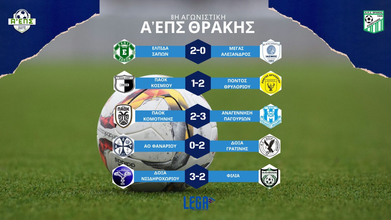 Share Facebook Email Ελπίδα Σαπών – Μέγας Αλέξανδρος Ιάσμου 2-0 ΠΑΟ Κοσμίου – Πόντος Θρυλορίου 1-2 ΑΟ Φαναρίου – Δόξα Γρατινής 0-2 ΠΑΟΚ Κομοτηνής – Αναγέννηση Παγουρίων 2-3 Δόξα Νέου Σιδηροχωρίου – ΑΠΣ Φιλία 3-2 Ρεπό: Δύναμη Αμάραντων ΕΠΣ Θράκης