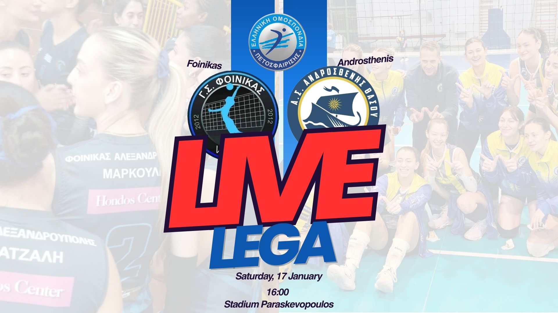 Share Facebook Email Αγώνας για την 13η αγωνιστική του πρωταθλήματος της Α2 Volley Γυναικών LIVE Α2 Volley Γυναικών Ανδροσθένης Θάσου Φοίνικας Αλεξανδρούπολης