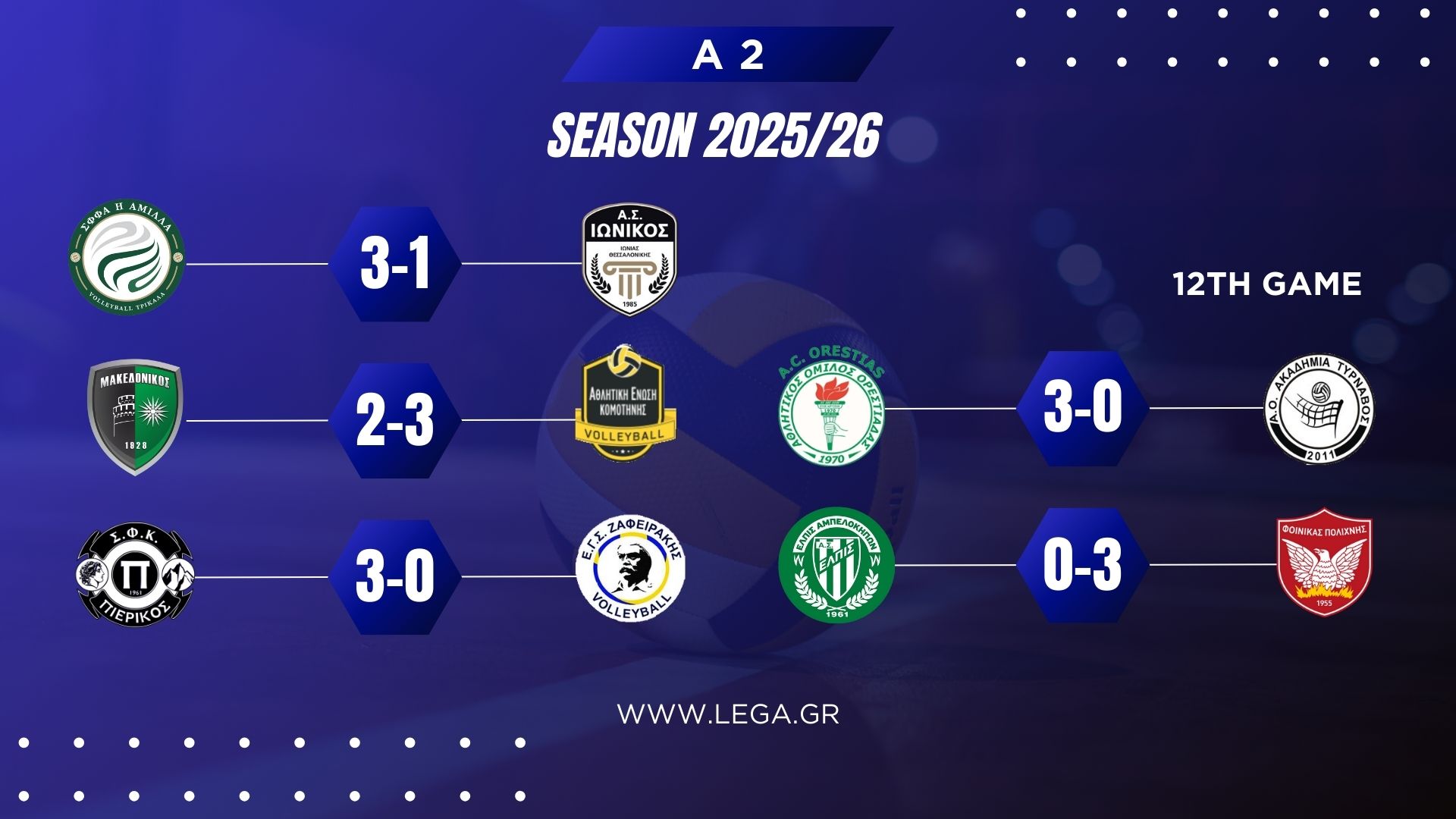 12η αγωνιστική στο πρωτάθλημα της Α2 Volley Ανδρών και έχουμε τα παρακάτω αποτελέσματα