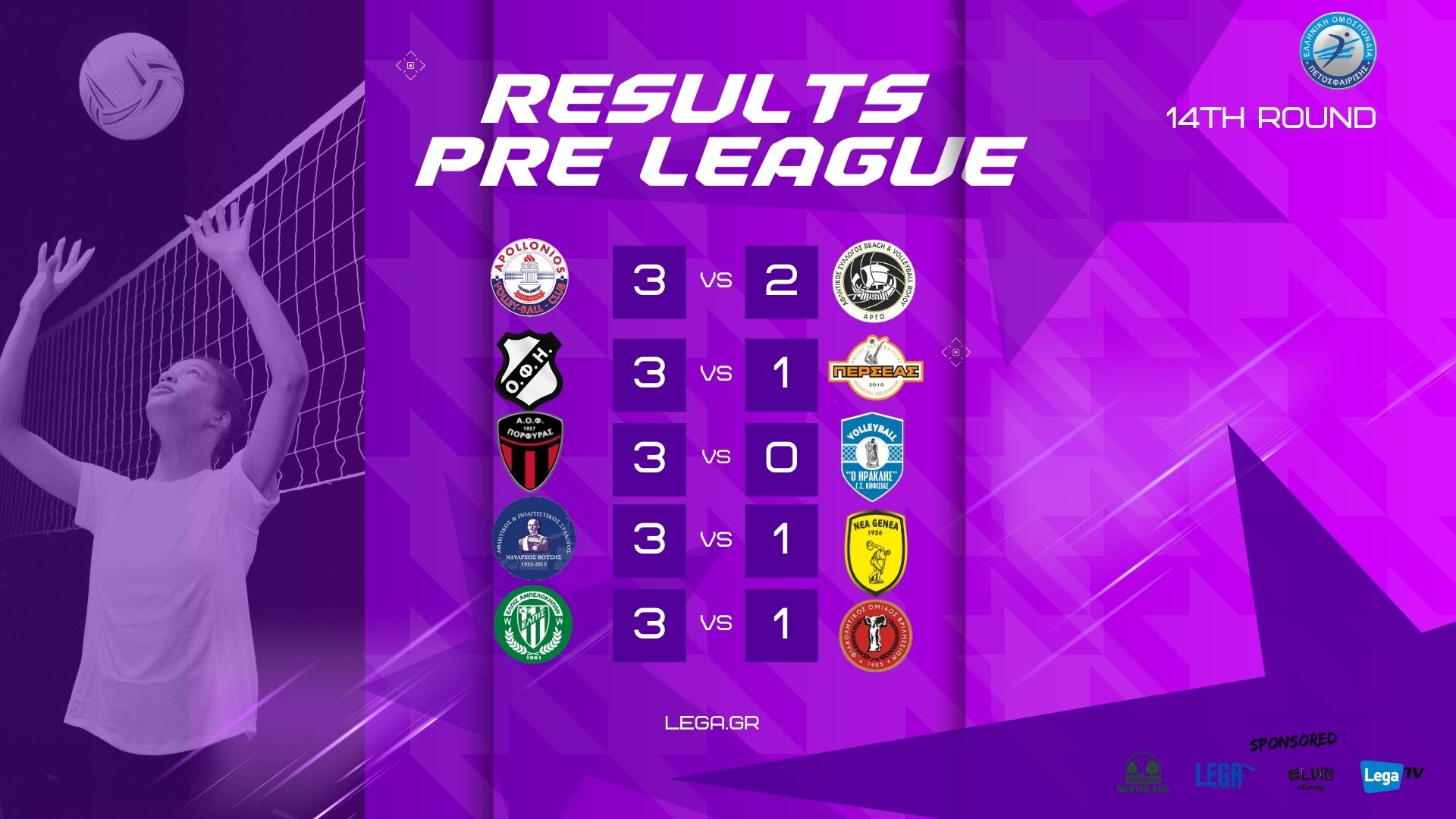 Share Facebook Email 14η αγωνιστική στο πρωτάθλητά της Pre League Γυναικών και έχουμε τα παρακάτω αποτελέσματα ΟΦΗ-Περσέας 3-1 Απολλώνιος-Άργώ Βόλου 3-2 Ναύαρχος Βότσης-Νέα Γενεά 3-1 Πορφύρας-Ηρακλής Κηφισιάς 3-0 Ελπίς-ΑΟ Βριλησσίων 3-1 Pre League Γυναικών