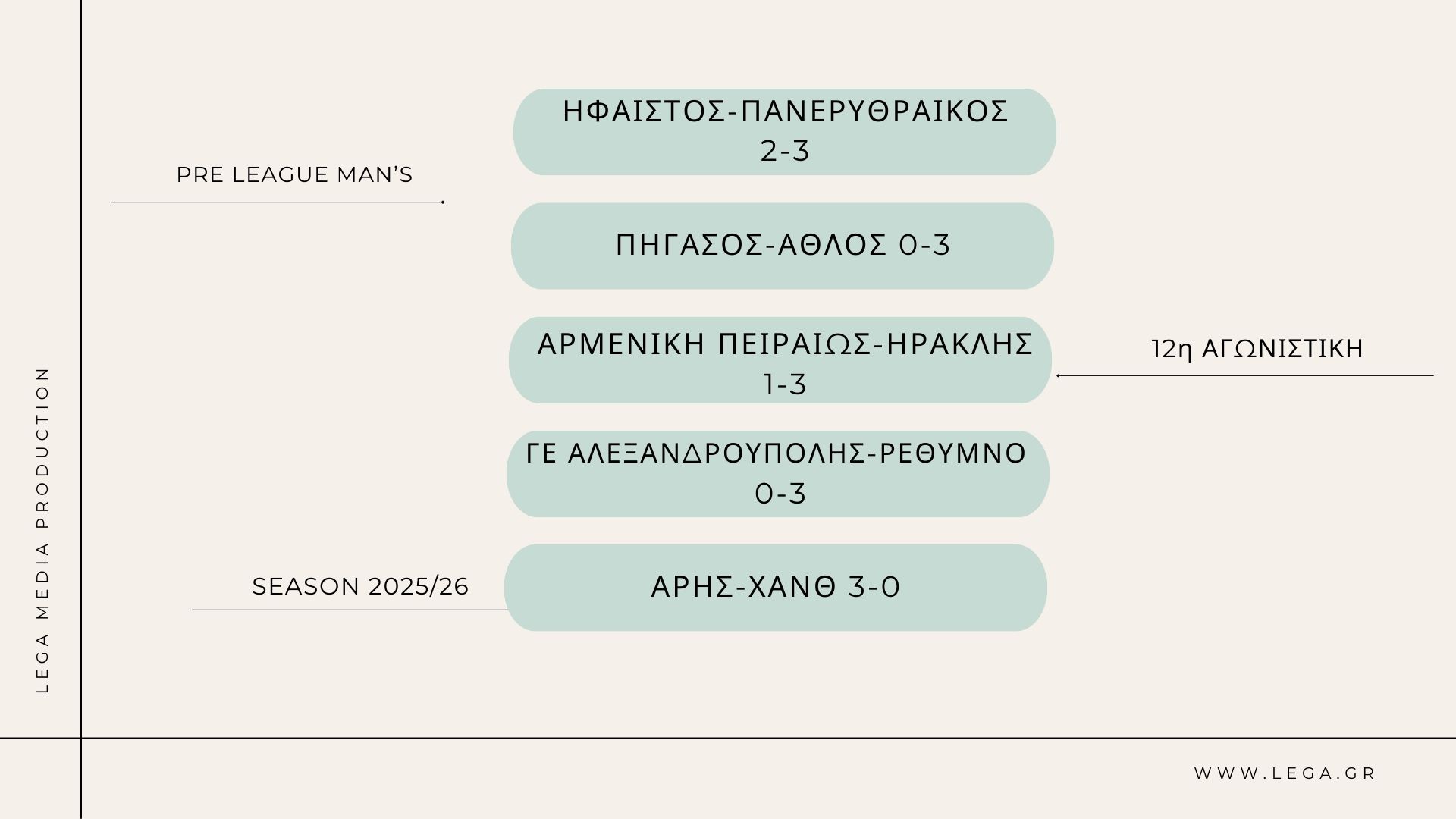 12η αγωνιστική για το πρωτάθλημα της Pre League Ανδρών και έχουμε τα παρακάτω αποτελέσματα