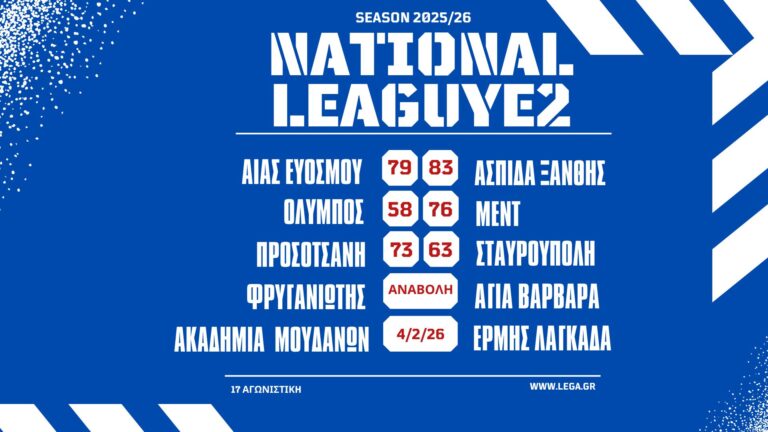 Share Facebook Email Εκπαιδευτήρια Φρυγανιώτη-Αγία Βαρβάρα (ΑΝΑΒΟΛΗ) Αίας Ευόσμου-Ασπίδα Ξάνθης 79-83 Ακαδημία Μουδανιών-Ερμής Λαγκαδά (4/2) Όλυμπος -ΜΕΝΤ 58-76 Προσοτσάνη-Σταυρούπολη 74-63 Ρεπό: Γαλάτιστα National League2